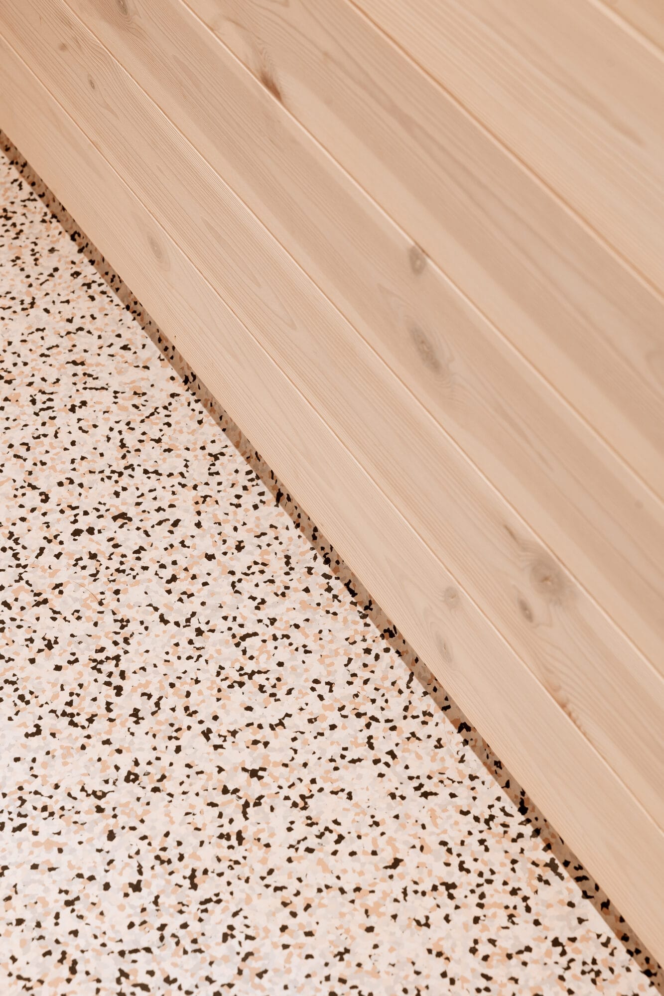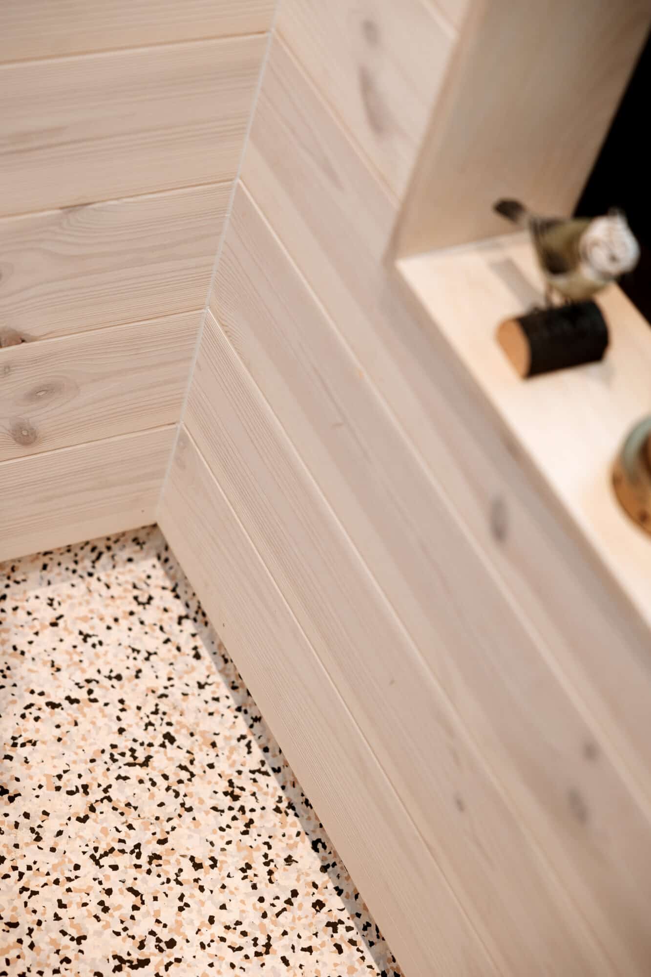 Heltregulvet fra InnTre Kjeldstad valgte vi fordi det gir en lunhet, vi ønsket ikke noe klikklaminat, det hadde ikke passet inn her. Vi kunne ikke ha gulvvarme siden vi ikke har strøm, da ble heltregulvet et godt og lunt valg. I tillegg til at det ble en fin kontrast til materialene vi valgte på veggene - plater i bjørkefinèr.