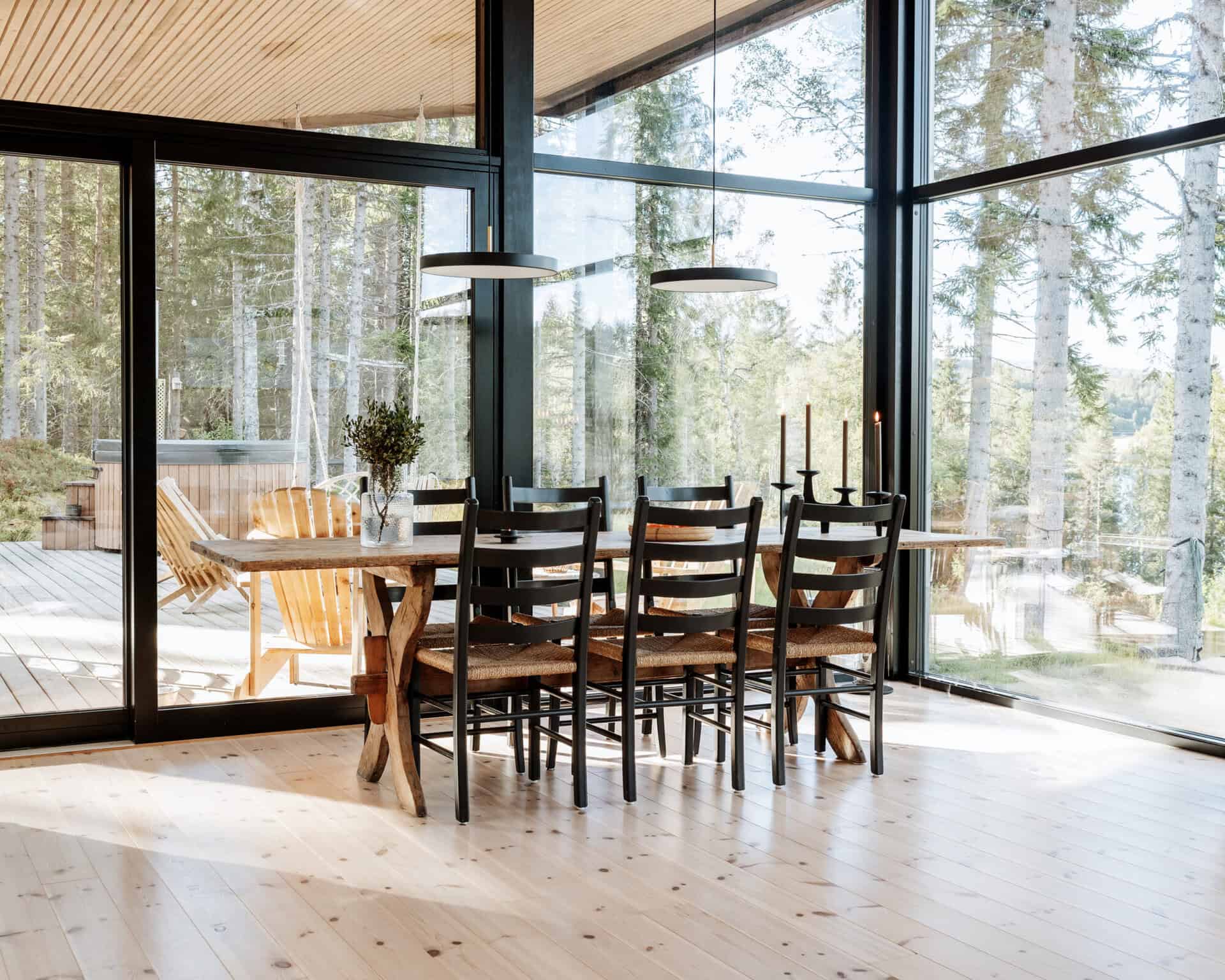 Ett av ønskene paret hadde ovenfor arkitekten, var å viske ut skillet mellom ute og inne. Det ble løst med store vindusflater ut mot vannet og skogen, og en takkonstruksjon som fortsetter ut over uterommet. Resultatet er et rom hvor grensene mellom natur og bygg nesten forsvinner.