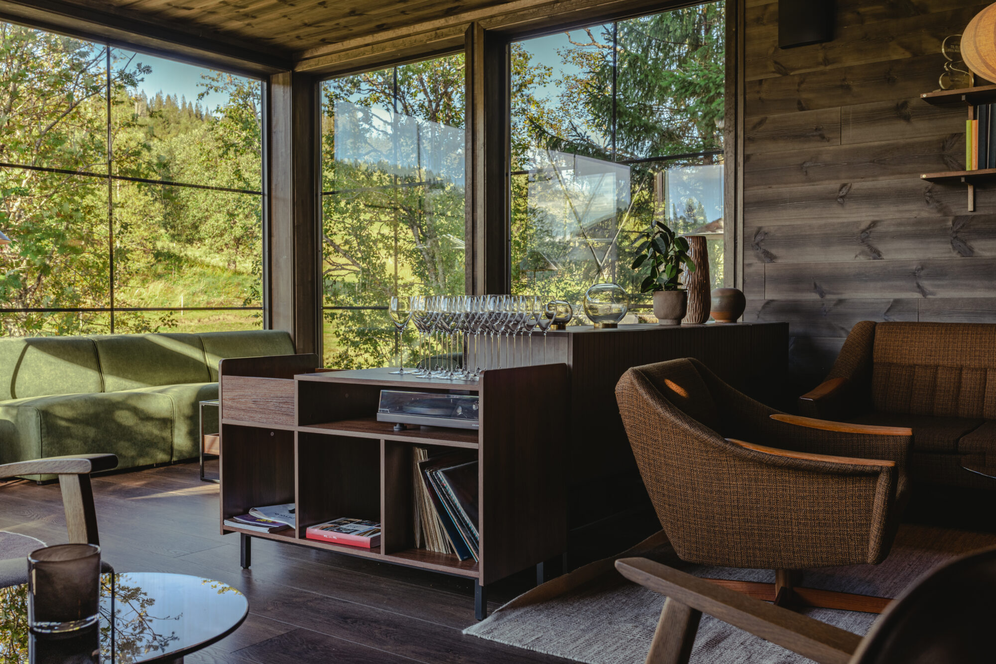 – Mange har gitt positive tilbakemeldinger på at vi turte å gå for en mørk farge i loungen – særlig nå som snøen har kommet. Det er med å gi fantastiske kontraster i rommet. De store vinduene slipper inn naturen, og gir et helt eget uttrykk.