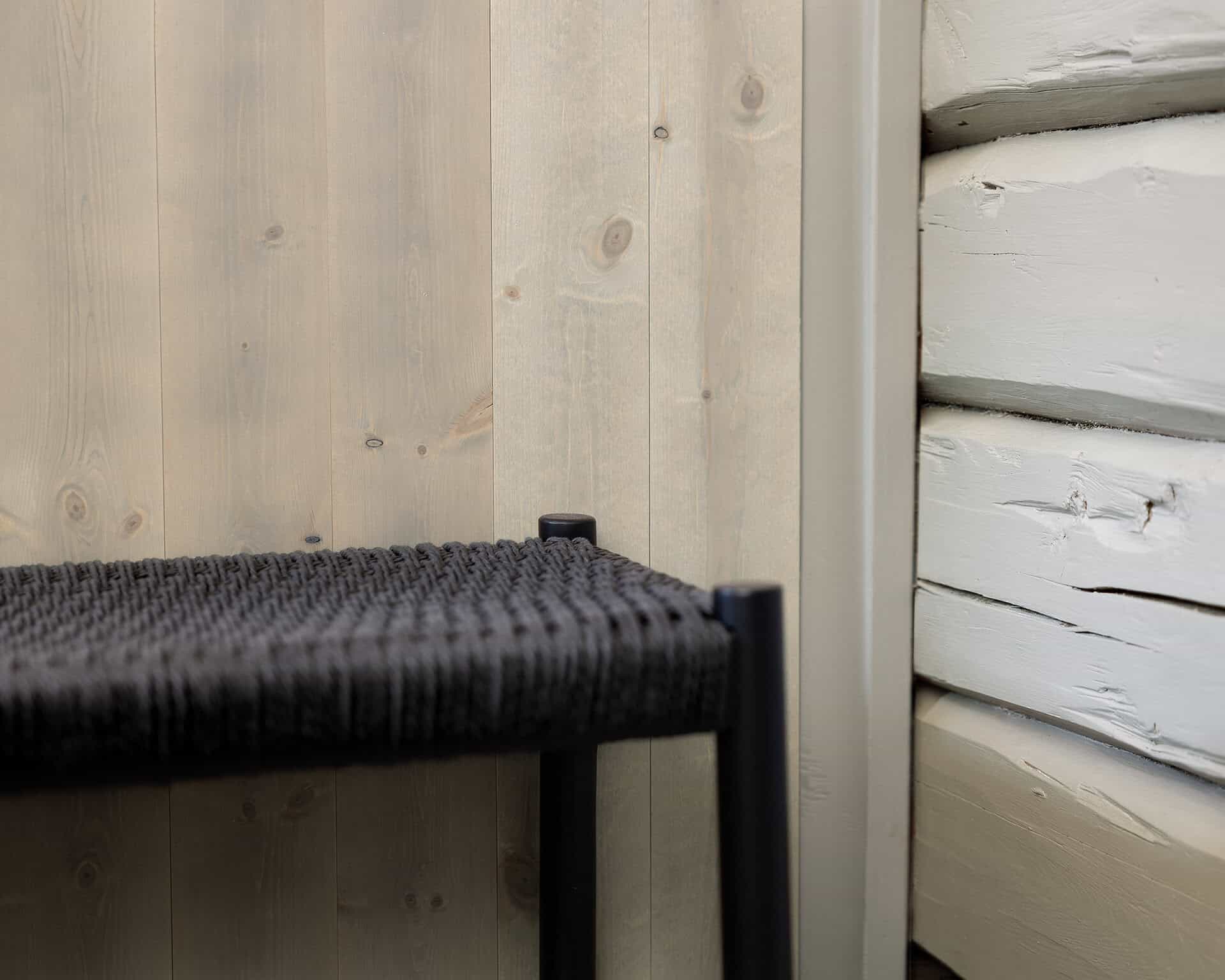 På instagramprofilen @ostre_hus deler Vibeke inspirerende interiørbilder fra hytta i skogen, hvor materialene får spille hovedrollen. Her er det brukt Sprekkpanel med hvitlasering – samt vårt heltre gulv med samme farge.